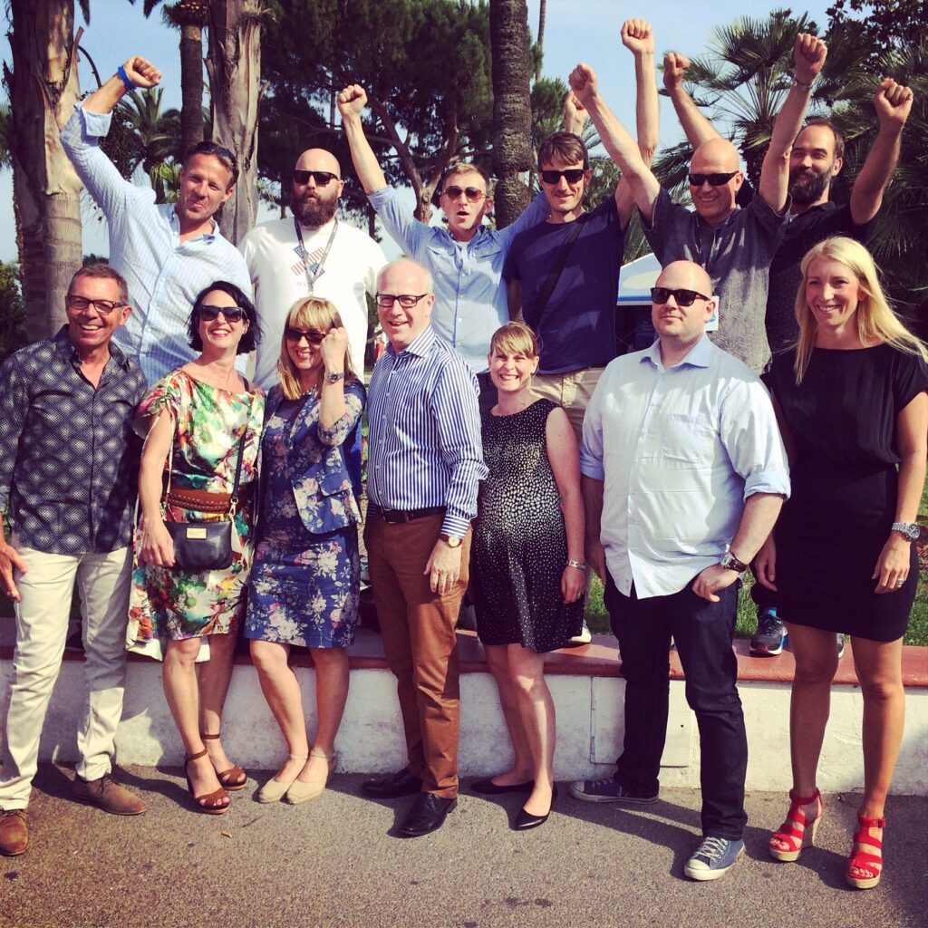 Lars Terling (i mitten) flankerad av två av sina medarbetare på Volvo och större delen av arbetsgruppen på Forsman & Bodenfors vid Cannes Lions 2014.